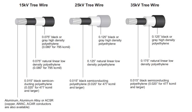 - • Tree Wire – Used for spans where trees crowd the right-of-way, such as in wooded residential areas.